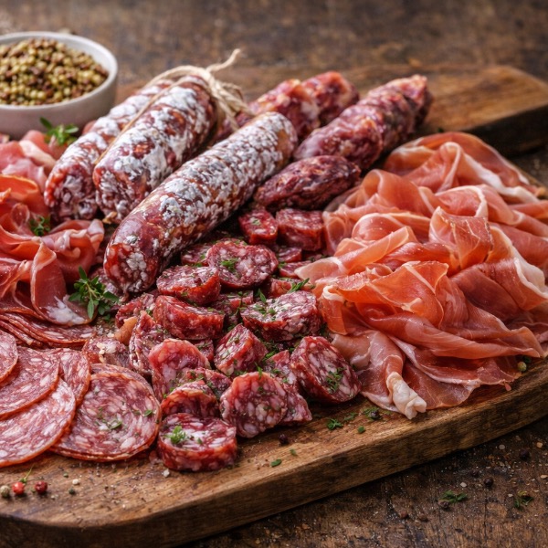 - Vleesplank met gedroogde hamsoorten zoals Coppa di Parma, Serrano ham, gerookte kip en roompaté