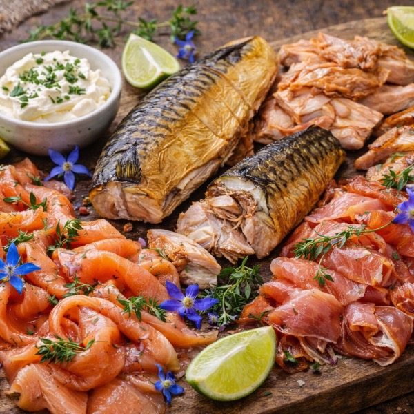 - Luxe visplank met gerookte zalm, makreel en forel. Uit te breiden met gekookte mosselen, verse oesters en paling.